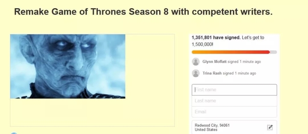 “有多等候,便有多失望”可以完美形貌“权游”粉丝的心态。截至支稿前,已经有逾越135万的粉丝背HBO请愿恳求重新拍摄《权益的游戏》第八季,而那一数字借正正在以肉眼可睹的速度删减。