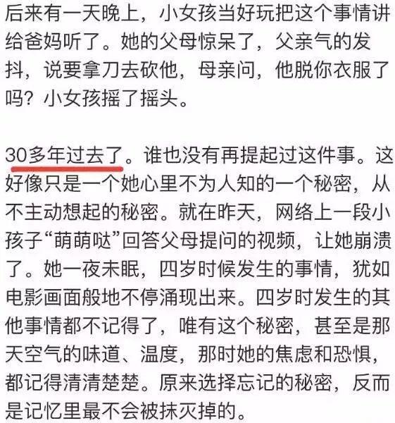 小女孩爸妈得知后,直言要砍人。后来30多年过去,当年的小女孩以为自己记了那件事了,直到三色事变的曝光。
