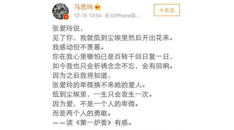 借记得当初流出马思纯饰演女副角的消息时,微专上的轩然大年夜波。马思纯宣布的闭于本做的读后感觉得那是一个闭于相爱的人遗憾错过的故事,得出的结论是爱情不能太卑微。功效网友纷纷热议。