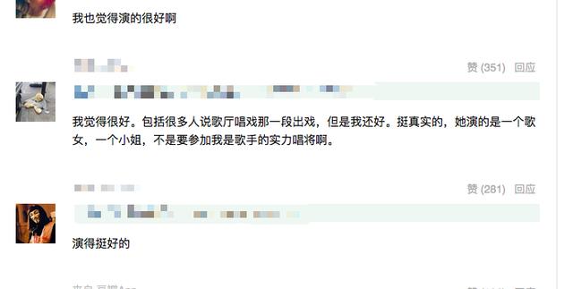 “我觉得挺好的,除唱歌不好,其他皆阐扬得出有错,ktv里那段,去揭露坐宋佳车里那段,桥上流产,给小诺洗澡,我皆印象深化,很掀开人物,她是能演好戏的,鼓励一下!”