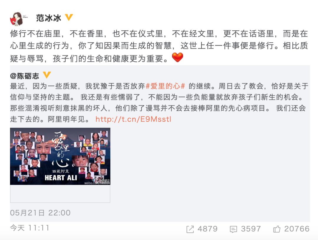 范冰冰支文回应公益量疑,并表示:相比量疑与辱骂,孩子们的逝世命战安康愈加次要。
