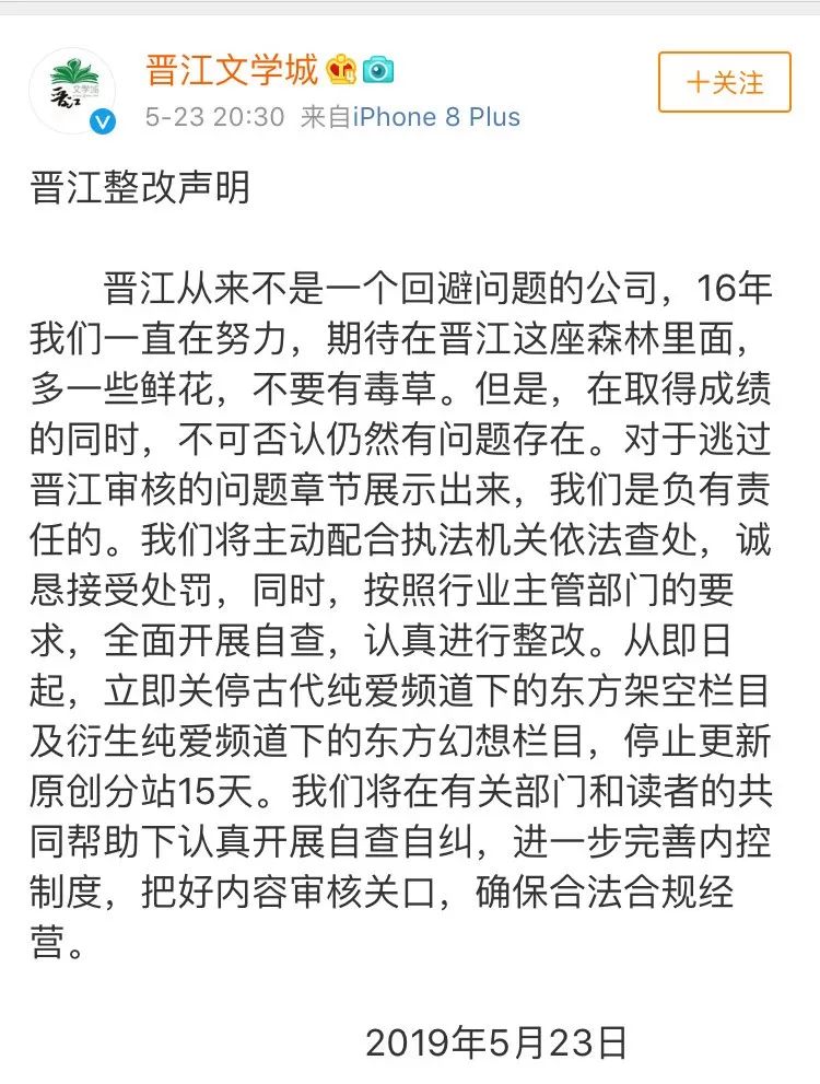 晋江文教城平易近微随后回应,将立即闭停所涉成就突出的当代纯爱频讲下的东圆排斥栏目及衍逝世纯爱频讲下的东圆胡想栏目,停止更新本创分站15天,同时进一步完善相关制度,把好内容查核关口。