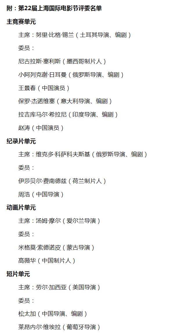5月23日,第22届上海国际电影节各单元评委名单颁布发表。主角逐单元评委会主席为土耳其着名导演努里·比格·锡兰。他将与中国演员赵涛、王景春、墨西哥制片人僧古推斯·塞利斯、俄罗斯导演小阿列克开·日耳曼、意大年夜利导演保罗·杰诺维塞、印度导演推凶库马我·希推僧共同选出那届金爵奖的获得者。