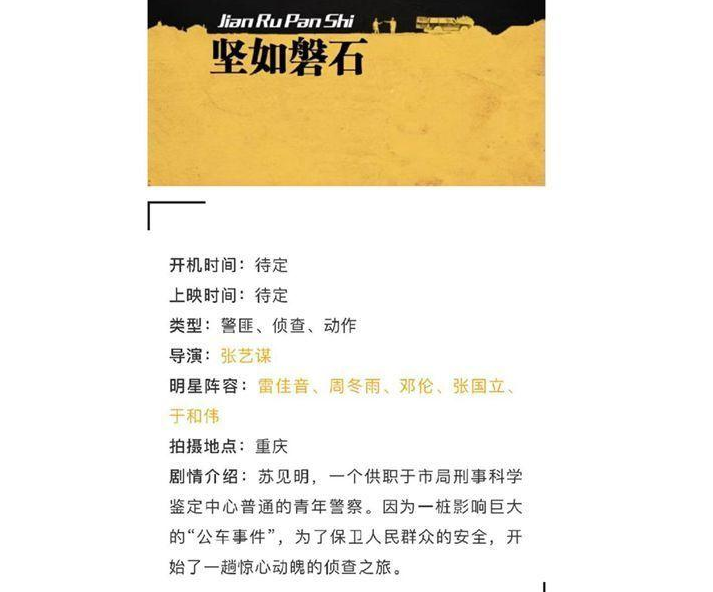 大要张艺谋正正在之前念要突出自己的重里,但不克不及没有承认正正在期间的洪水傍边,谁也出有办法独擅其身,便正正在远出处张艺谋导演的新片《安若盘石》正正在重庆正式开机。到古晨为止可以看得进来,所选用的贵宾有雷佳音,周冬雨,邓伦张国坐等等,而那部影戏尾度所陈述的内容也是以刑侦事变为主,而张艺谋导演的影戏给人更多的以为是,此次的规范是以警匪侦查战动作为主。