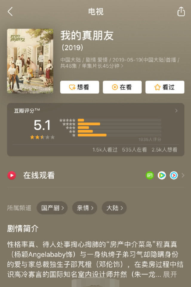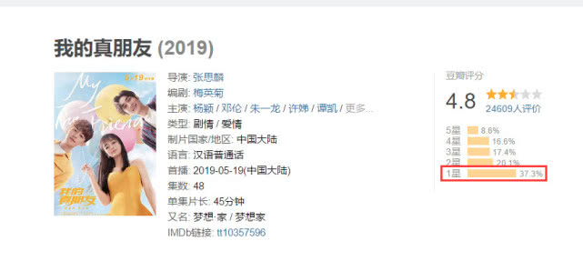 正正在播出几天当前,《我的真朋友》的豆瓣评分再度显现跌降,原来5.1分的做品如今已经跌降到了4.8分,而正正在评价中仅仅一星的好评,便占据了37%。