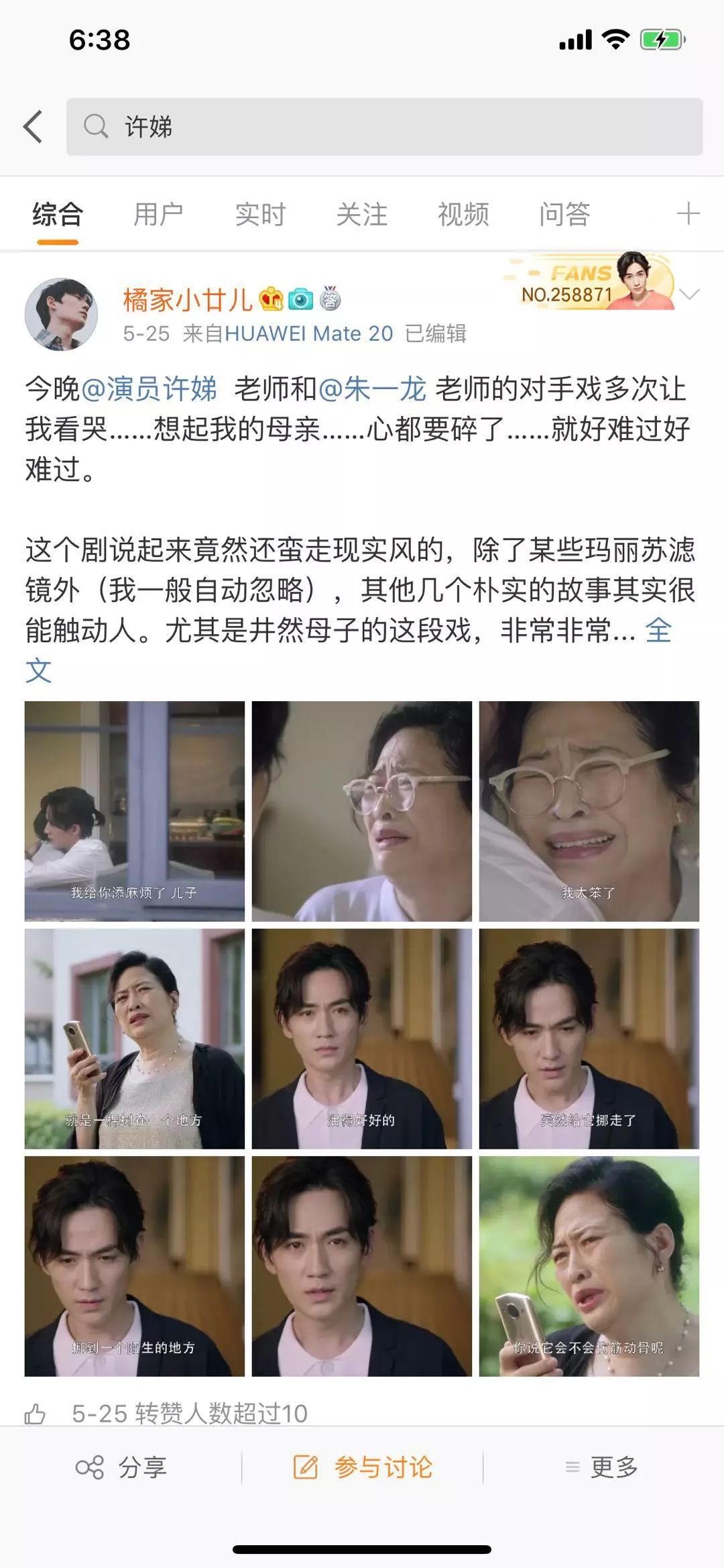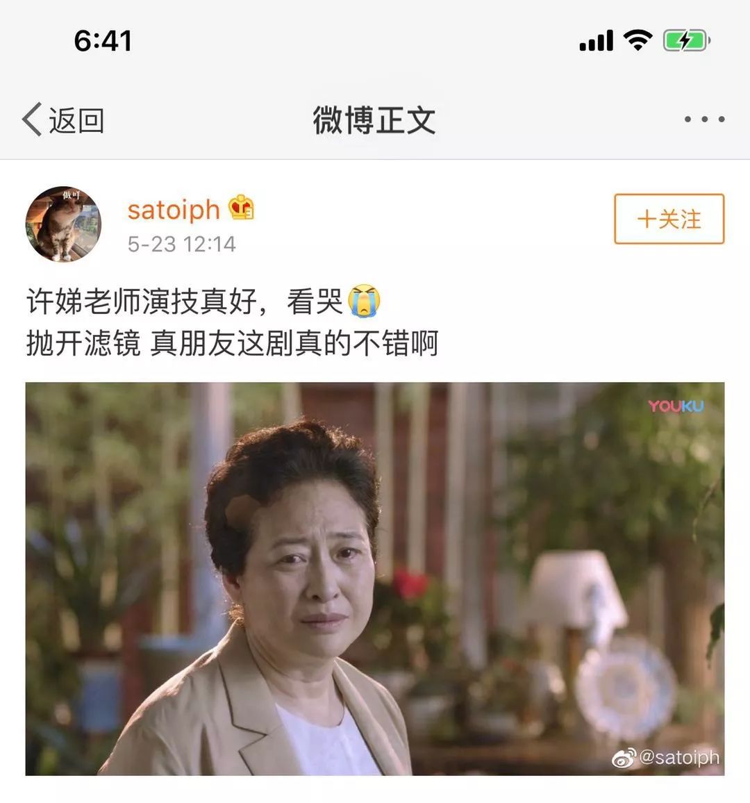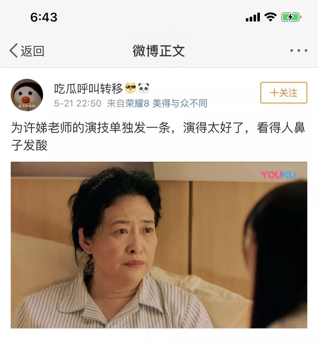 很多年轻的孩子们本来是冲着朱一龙、杨颖、邓伦去看剧的,看着看着居然被许娣的戏看哭了,被老戏骨佩服,天天挨卡变成了许娣的粉丝。