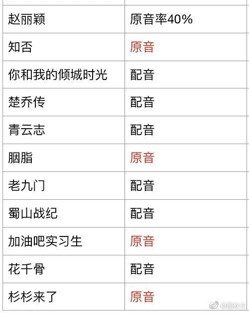 从统计表可以看到,baby进军当地影视圈后已经播出的电视剧共有4部,其中《云中歌》战《孤芳出有自赏》两部被吐槽得很惨的剧为配音,而去年播出的《创业期间》战古晨正正正在播出中的《我的真朋友》为现场本音声收音,算是相比此前有了行进。