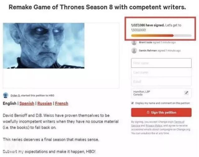 以致有权游迷正正在搜集上请愿,希冀HBO可以辞退两位编剧,并且重拍第八季。如今请愿人数已经突破150万人。