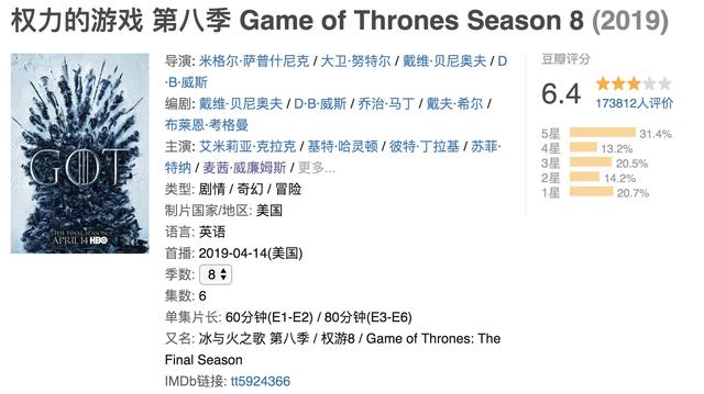 权游谁人惊世的IP,从神坛跌降,只用了最后一季的最后三集。末极季评分果烂尾的果素,评分不竭持续走低,不竭到了如今的6.4分。