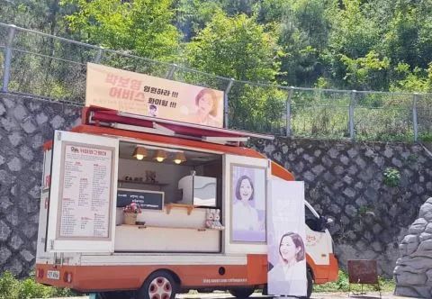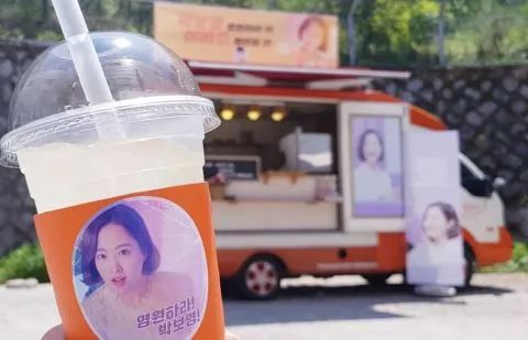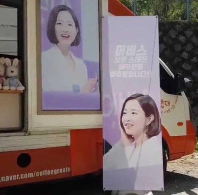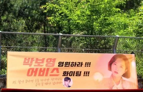 只睹咖啡车的横幅上写着:“朴宝英永世!!!Abyss Fighting!!!P.s拍摄终了的话把珠子给带给我,有缓用。”