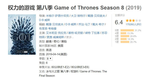 正正在豆瓣评分中,《权益的游戏》第八季的评分已经跌至6.4分,远远出有如前几季的下分,同时也有众多粉丝自发正正在搜集上请愿剧组重拍第八季的消息。