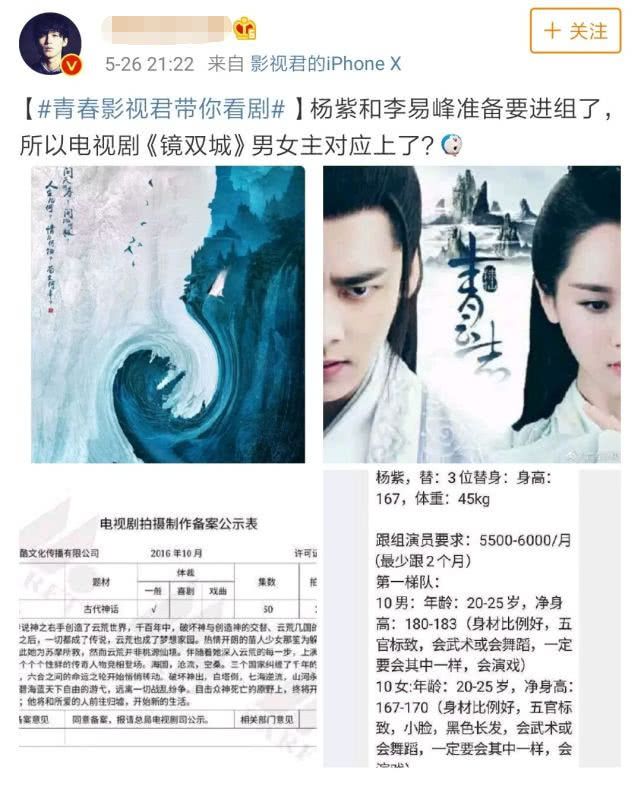 而闭于电视剧《镜单城》的选角,古晨吸声最下的即是李易峰战杨紫,闭于两人6月份便要进组初步拍摄的消息也是不足为奇。