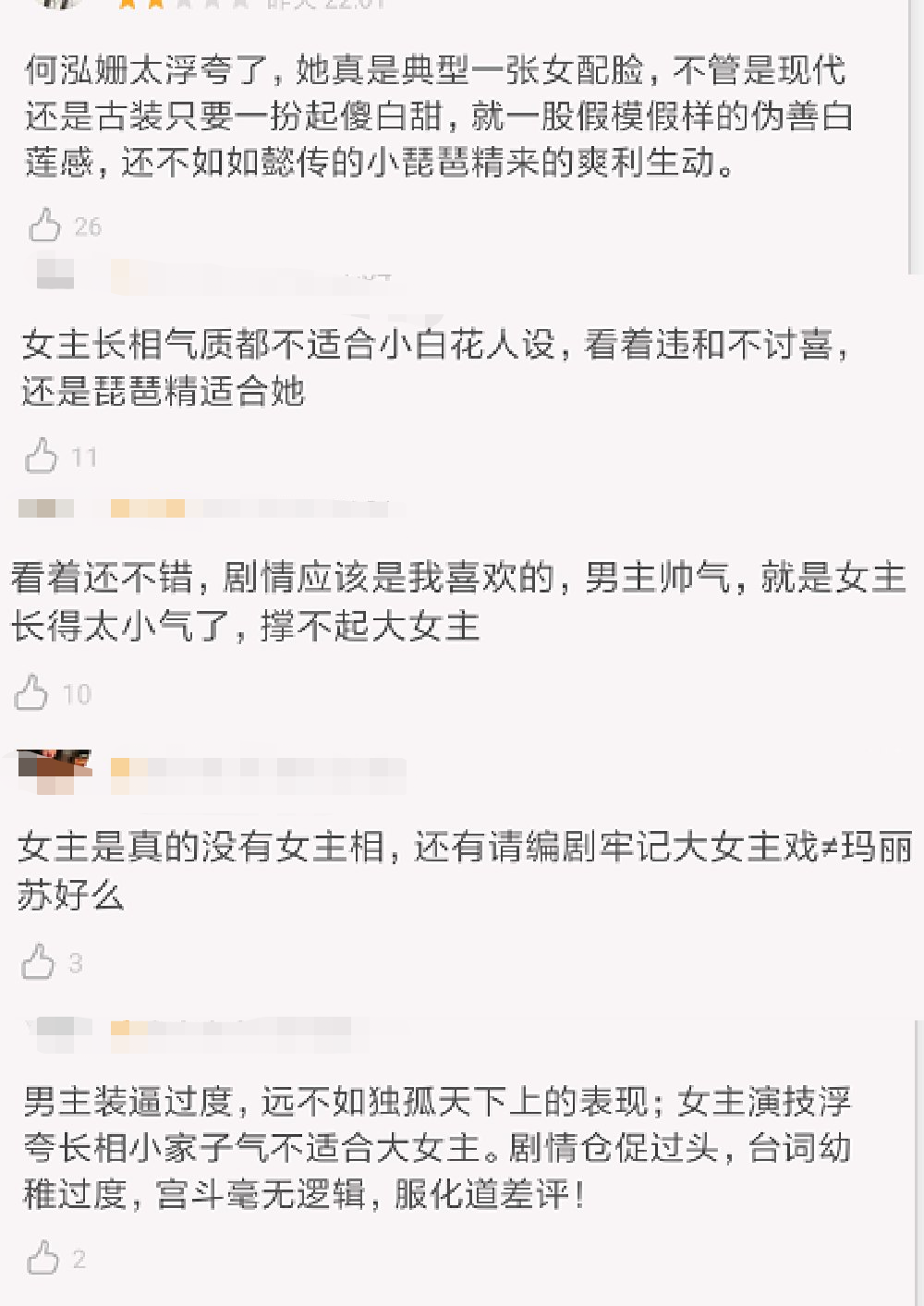 借有一些人觉得女主属于小家碧玉型女孩,实正正在霸气不够,假设她出演亲爱角色完好可以,但出演影响了一个国家的霸气贤妃,难免让人担忧。一些网友觉得何泓姗的颜值出有太适宜担当大年夜女主,以致直言她少了一张女配脸,易以操纵独霸大年夜女主气魄气派,相比之下,借是更爱好看她出演的小琵琶细,似乎那个角色更适宜自己。