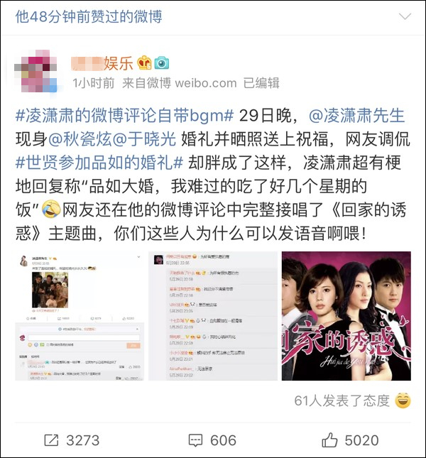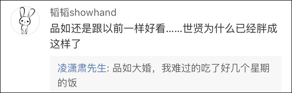 “世贤”来到场“品如”的婚礼,网友们正正在凌潇肃的微专攻讦区里齐齐唱起了那段生习的旋律:“为统统爱刚强的痛,为统统恨刚强的伤……”