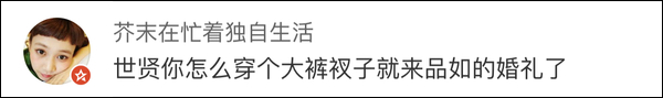 其他贵宾大年夜多着正拆,穿着个大年夜花裤衩子的世贤正正在婚礼现场隐得格格不入。