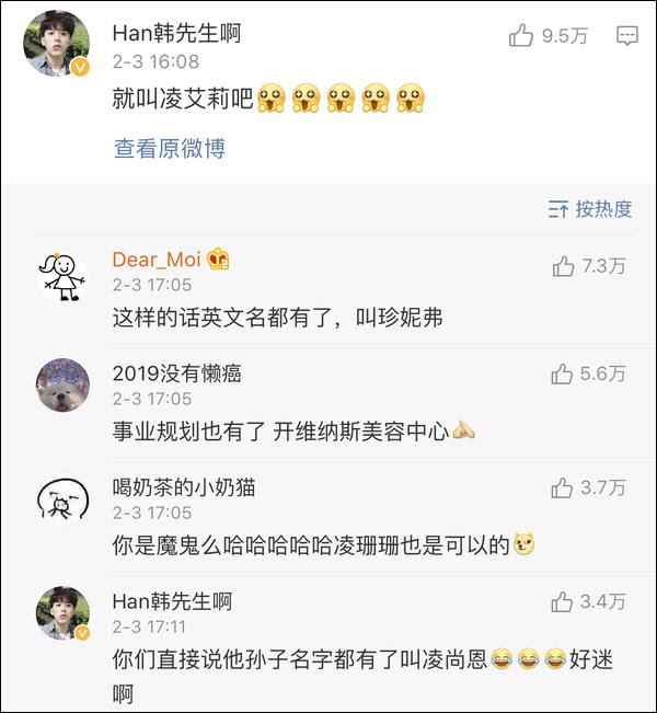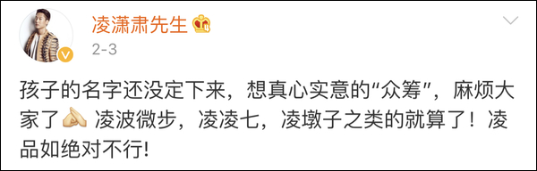 今年2月,凌潇肃的小女女降生后,他正正在微专背粉丝“众筹”宝宝的姓名,借出格提了一嘴“凌(林)品如尽对不成”。