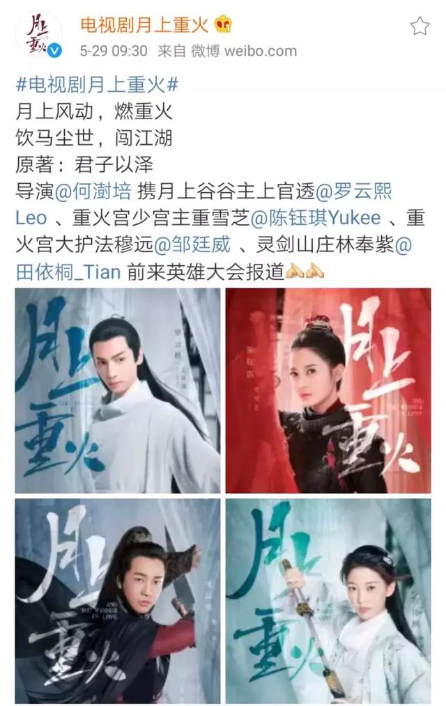 5月29日,电视剧《月上重火》平易近宣主演阵容,由罗云熙饰演男主月上谷谷主上平易近透;陈钰琪饰演女主重火宫少宫主重雪芝;邹庭威饰演重火宫大年夜护法穆远;田依桐饰演灵剑山庄林奉紫。