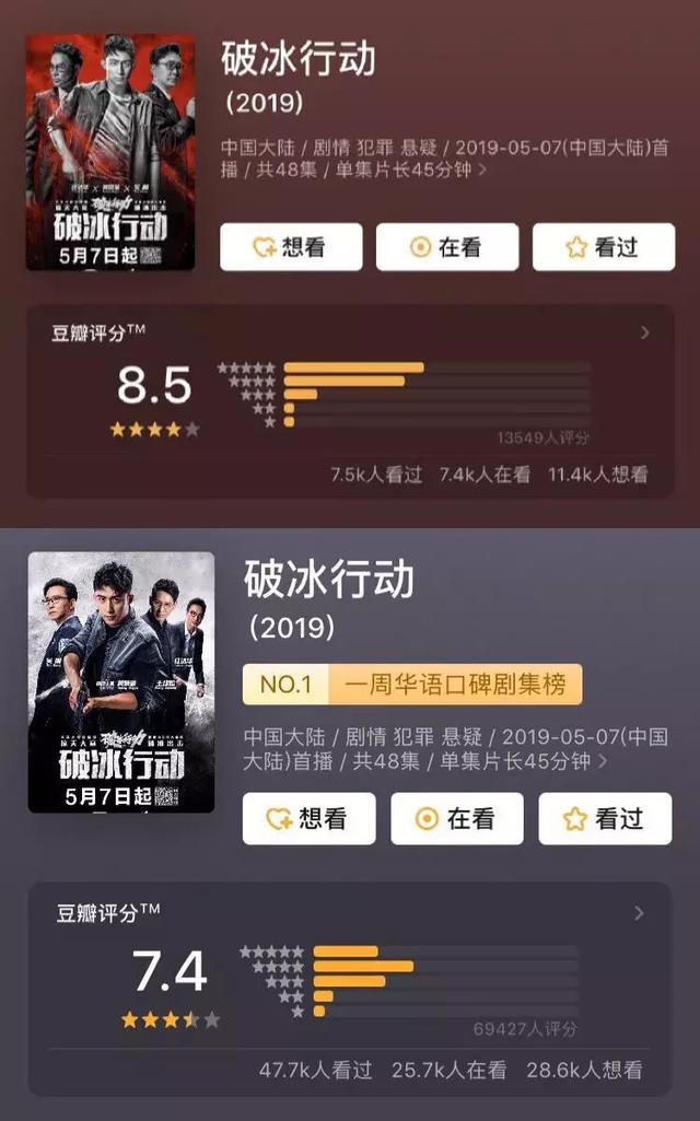 《破冰行动》的豆瓣评分从开播的8.5分下滑至结局的7.4分,导演出里抱愧,《破冰行动》成了电视剧下开低走的范例!