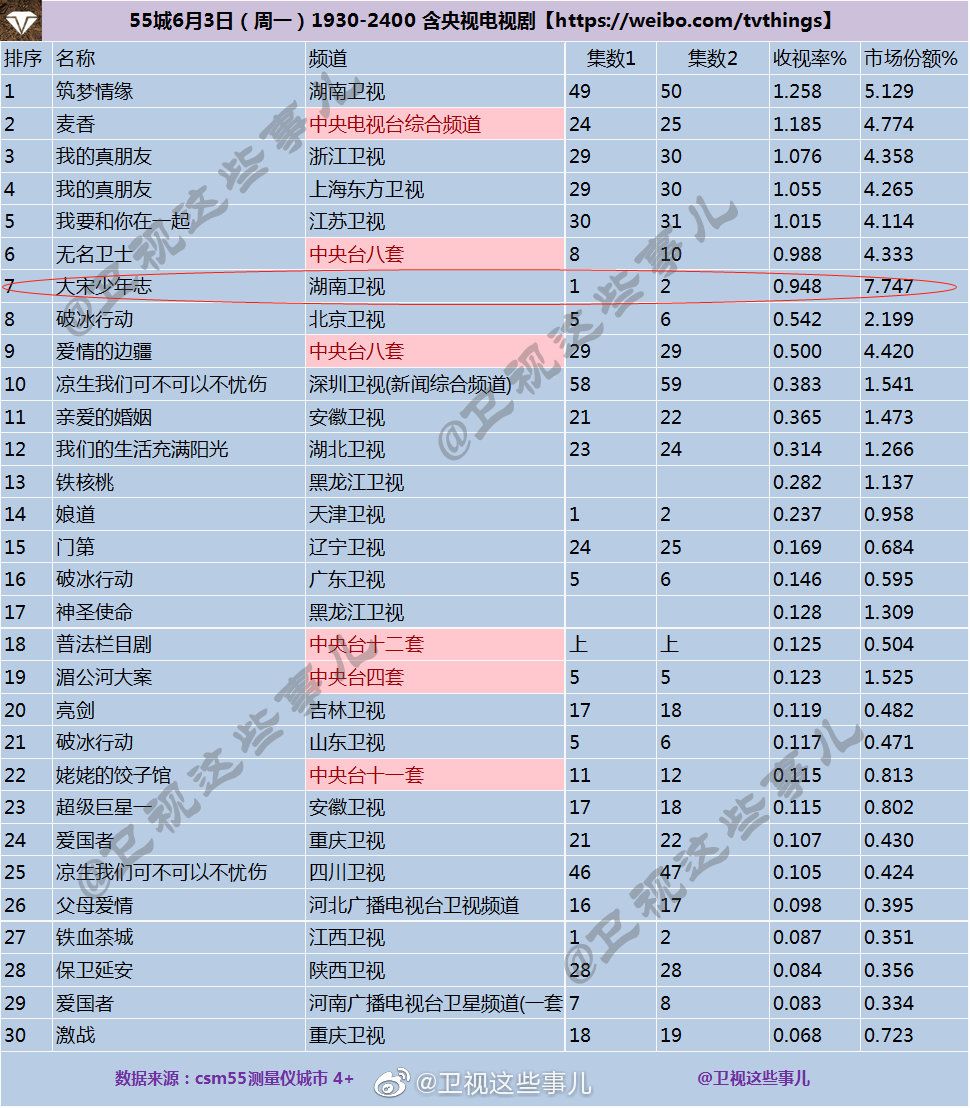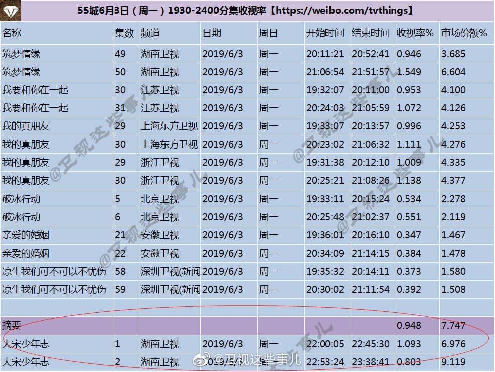 但被临危授命的《年夜宋少年志》从团体的播出数据上去看,表示借算没有错。CSM55乡(露央视频讲)6月3日,湖北卫视《年夜宋少年志》7.75%市场份额排名第一,支视率0.948%,排名第七,第一是湖北卫视黄金档播出的《逐梦情缘》,1.258%。