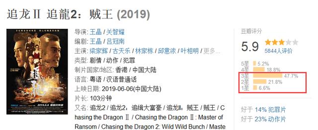 《逃龙2》上映两天乏计票房只要6000多万,猫眼猜测票房仅仅2.83亿。从豆瓣上能够看出,该片三星以下好评率下达76.1%。那个分数借会跟着工夫持续降低,果为借有一些奔着古天乐战梁家辉而去的粉丝,正在来影戏院的路上。