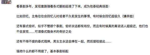 不外,关于泰剧的套路也有不雅寡吐槽道:“好比回想,配角常常会回想女时大概没有暂前发作的工作,偶然候会回想超等暂(厌弃脸),借有泰式偷听,仿佛没有管哪一个泰剧,偷听永久皆有戏份,并且偶然候实的离道话人超等远,他们也没有会发明……可谓泰式隐身术的巧妙的地方,借有不能不提的泰式假摔,男女主永久会摔正在一同,然后注视相互……强吻甚么的皆不消提了,根本泰剧标配。”