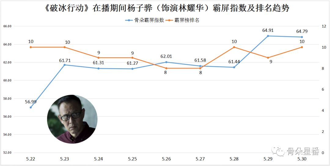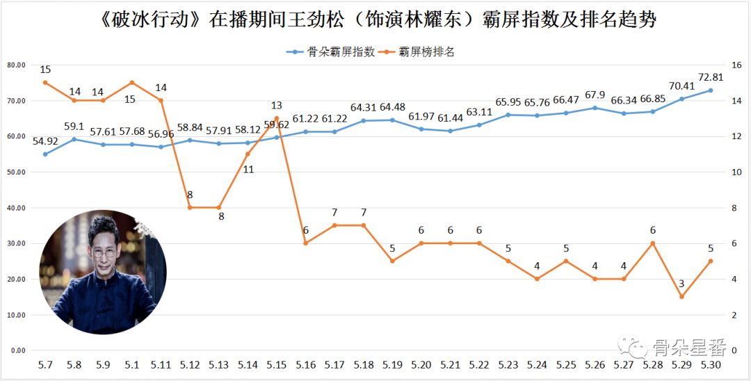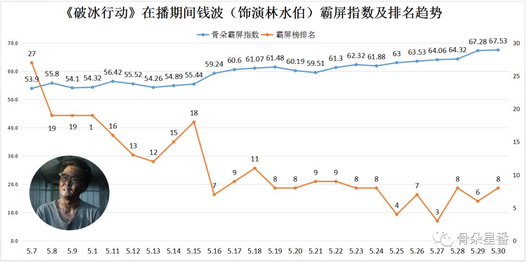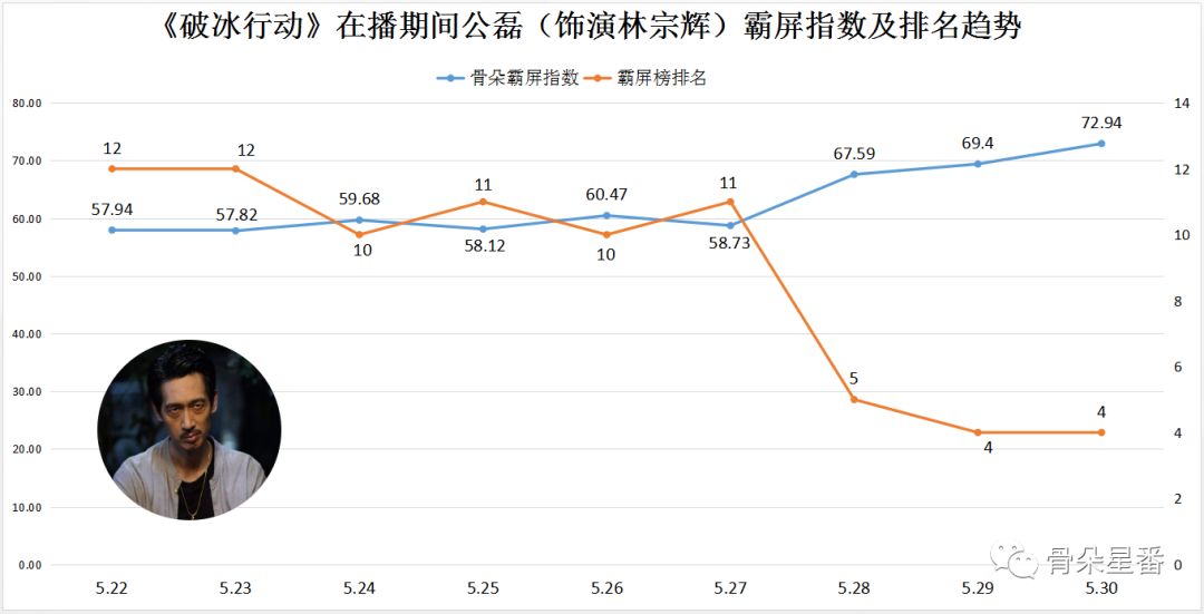 「社会我辉叔,人狠话没有多。」脚色林宗辉及演员公磊胜利出圈。特别是《破冰动作》正在播的最初三天,公磊的受存眷度绝后,霸屏指数走下,连结正在第4、5位。