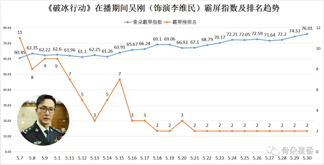 其饰演者吴刚那奥秘的、似笑非笑的眼神战轻轻撇动的嘴角正在《群众的名义》中便呈现过,成为典范的吴刚式心情,那一细节十分契合脚色需求。吴刚也是该剧“叔圈”演员中最受存眷的,以下图所示,《破冰动作》正在播时期,吴刚的霸屏指数连续走下,正在齐剧末时到达高峰。