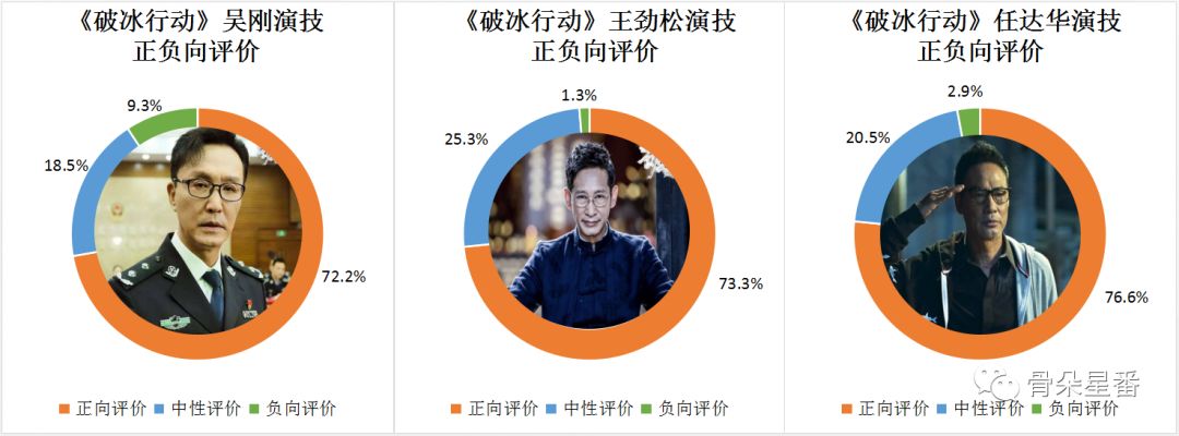 骨朵数据次要阐发了吴刚、王劲紧、任达华那三位演员,由下图可知,他们三位正在《破冰动作》中的演技皆得到了承认,正背评价均超越72%,此中任达华靠近77%。如果计较那三位演员的演技的正背战中性评价,更是超越90%,此中王劲紧下达98.7%、任达华下达97.1%,“叔圈”演员演技受承认度颇下。