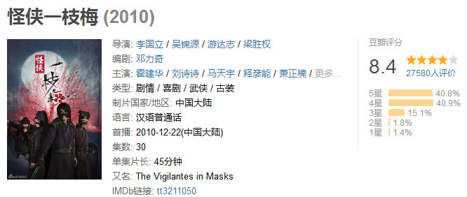 《怪侠一枝梅》实在是唐人的诚意之做,不管是剧情、演技、挨戏皆是一流,惋惜昔时出有年夜水,但豆瓣8.4分,至古借被人提起足以阐明那部剧造做有多优良了。