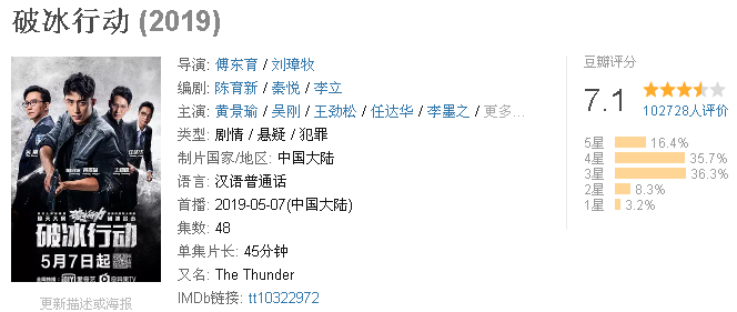5月份,由黄景瑜、吴刚、任达华、王劲紧等人主演的《破冰动作》,果为编剧没有给力,李飞、陈珂两个配角成了人物薄弱的拖后腿脚色,出格是末端曲线降落的剧情,招致不雅寡不竭的吐槽,如今的豆瓣评分只要7.1。