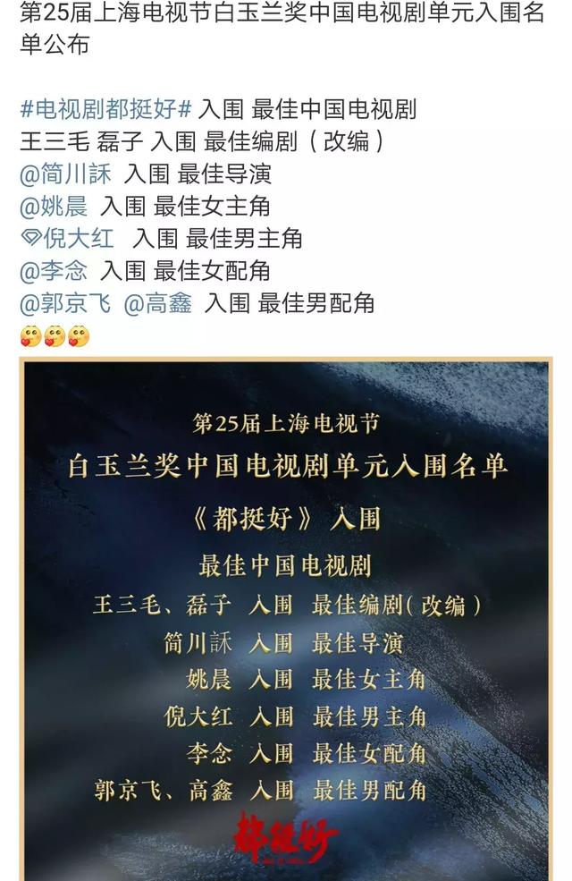 电视节落幕之前,《皆挺好》便同时进围电视剧单位7个奖项的提名,成了本届黑玉兰奖的夺冠热点剧。