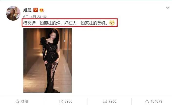 颁奖仪式完毕后,姚朝正在交际仄台收文称本人奖运自始自终的好,她借晒了一张本人的好照,虽然照片里的姚朝笑得很高兴,仍然能让不雅寡看出她的没有甘愿宁可,不外她后一句话人自始自终的好呀,则奇妙化解前一句的为难,不能不道姚朝情商实的很下。