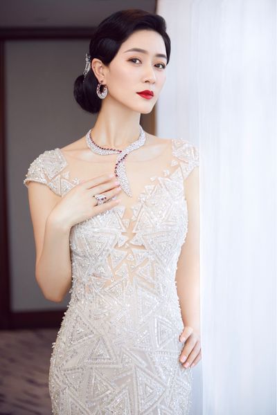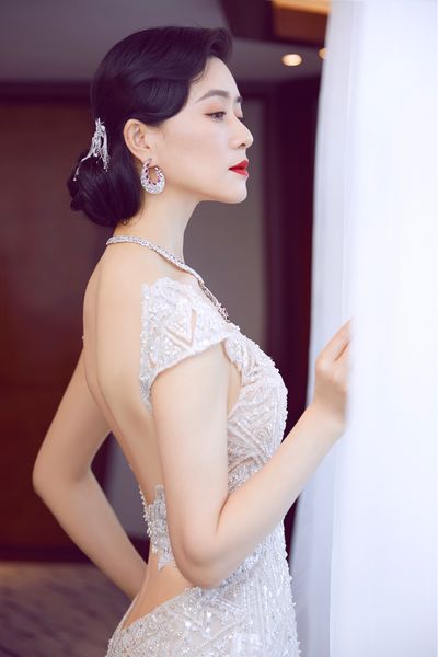 白毯上田海蓉,一袭喷鼻槟色露背曳天初级钉珠早礼少裙,佩带ARTRIUM周年夜祸艺堂白妆初级珠宝,复古好莱坞典范收型,气场非常壮大。