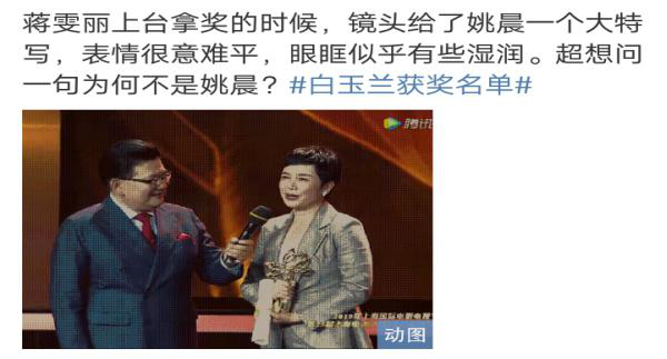 本题目:蒋雯丽获黑玉兰奖视后,镜头给了姚朝一个年夜特写,她自嘲命运