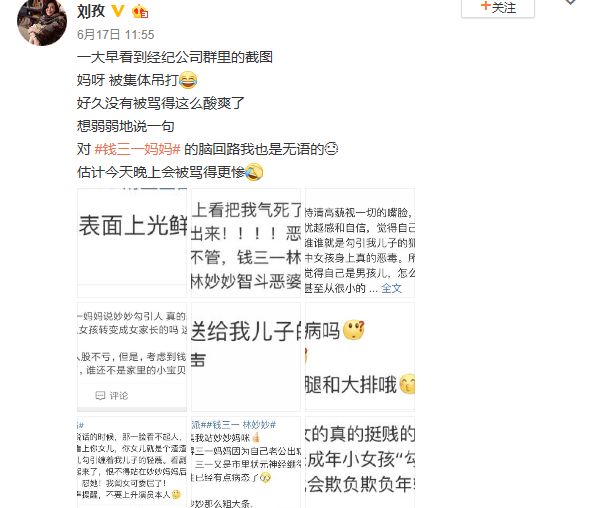 掮客公司把那些批评截图收给刘孜,把她吓了一跳,刘孜收微专道,她曾经好久出被被骂得那么酸爽了。而且她也暗示,做为演员实在她也不克不及了解附和钱三一妈妈的做法。