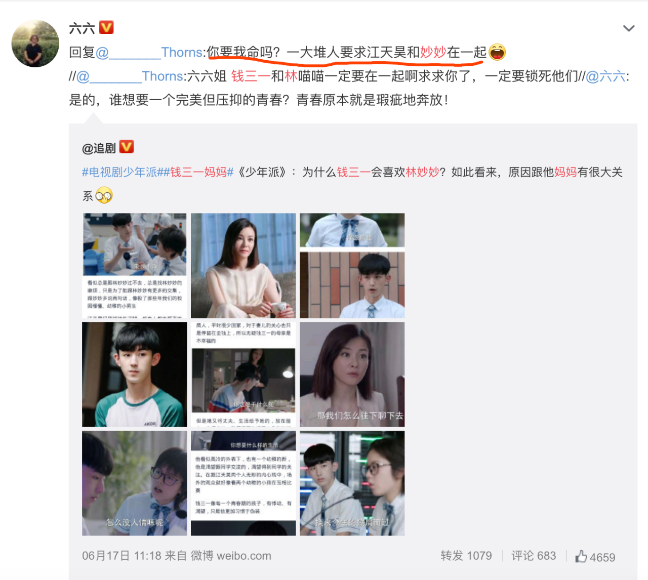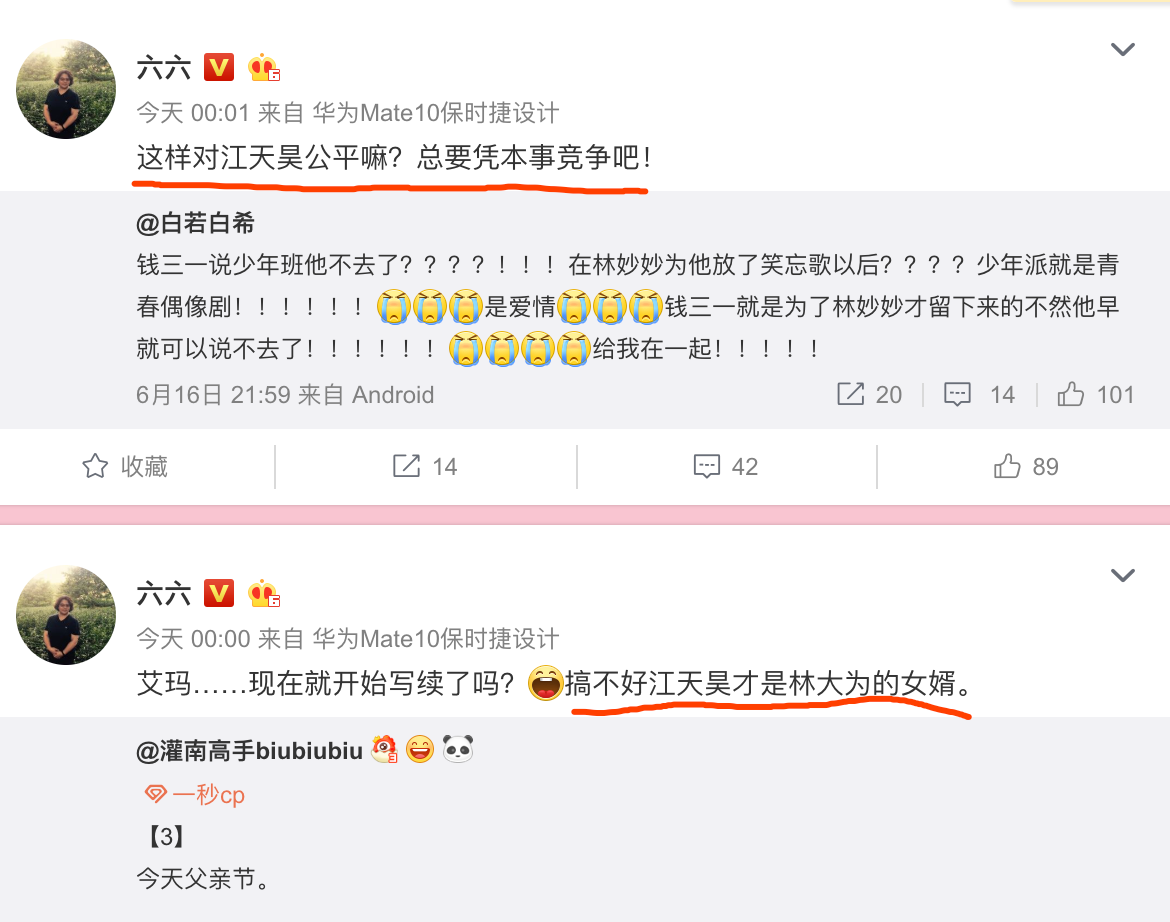 正在钱三一取林妙妙那对剧中CP人气下涨当中,编剧六六仿佛没有行一次的泼热火,且屡次扯上了江天昊,看去前面的剧情开展中,江天昊喜好上林妙妙是实的。