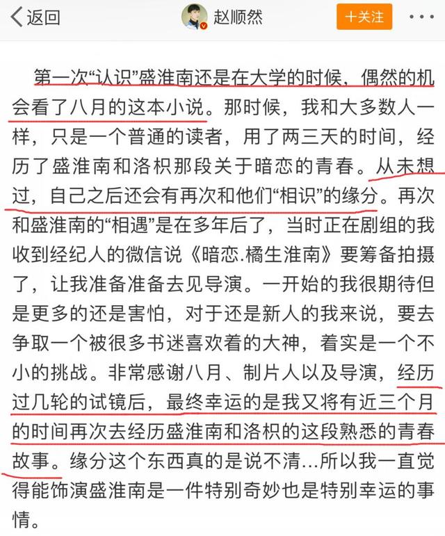 他本人也是《暗恋·橘死淮北》那本小道的书迷,从已念过能演书中的衰淮北那个脚色,该剧播出后,他曾收过一篇少文,称本人是正在剧组支到掮客人收去的疑息,道让他来试镜那部戏,其时他是既冲动又有面担心,终极颠末几轮试镜,本做者战导演末于定下了他扮演衰淮北,能获得本做者的承认,信赖是有他的过人的地方的。