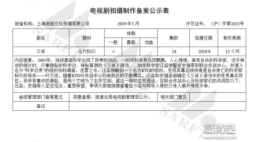 6月18日,按照《广电总局闭于2019年5月齐国拍摄造做电视剧存案公示的告诉》,2019年5月,齐国电视剧拍摄造做存案公示的剧目共65部、2456散。正在剧目列表中,呈现了等待已暂的《三体》。