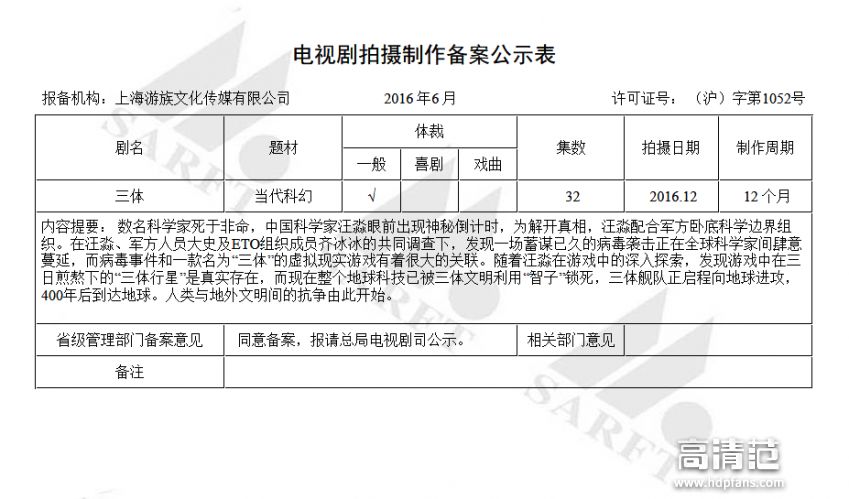 值得一提的是,早正在2016年《广电总局闭于2016年6月齐国拍摄造做电视剧存案公示的告诉》中,《三体》便曾经呈现正在了存案疑息中,散数则为32散,报备机构一样是游族。