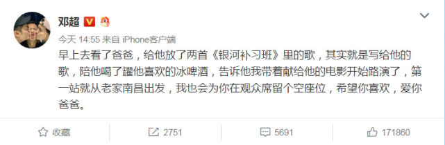 正在远日,由邓超导演并主演的《银河补习班》也行将上映,关于本人的新做品,邓超自己更是正在微专上公然收文思念爸爸:“早上来看了爸爸,带着献给他的影戏开端路演了,从故乡北昌动身,我也会为您正在不雅寡席留个空坐位。”