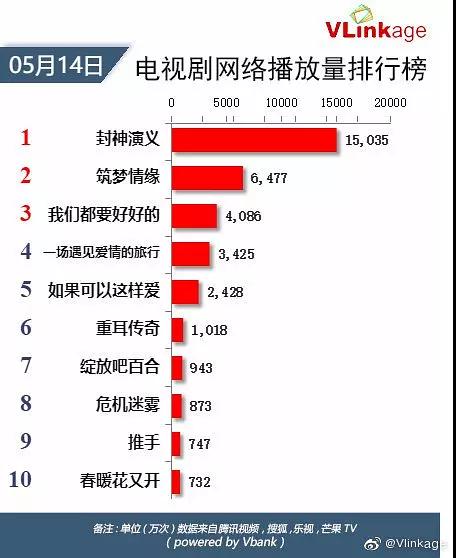 远日,Vlinkage公布5月14日当日电视剧排止榜,电视剧《启神演义》以日播放量1.5035万的成就占有电视剧收集播放量排止榜第一位。