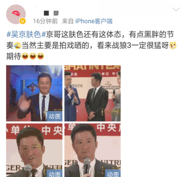 吴京做为上海影戏节推行年夜使到场了终结典礼,正在白毯上吴京气魄高昂,几乎是荷我受爆棚。从现场的路透图看,吴京的肤色乌出了新天涯,素有硬汉之称的吴京肤色自己便比力乌黑,此次走白毯像是来了一趟非洲,被网友讥讽:“乌成冰了!”