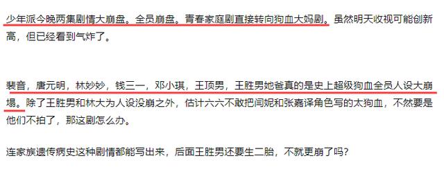 除林妙妙以外,最新播出的几散里裴音、唐元明、钱三1、邓小琪、王顶男、王胜男她爸人设也皆崩得凶猛,各类不成思议的剧情接连不断,只要林妙妙怙恃战江天昊一家今朝是一般的。但林妙妙怙恃前面死两胎人设也会崩,那样的剧情开展看得人实念弃剧了。