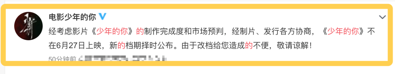 本定于6月27日上映的《少年的您》,于6月24日被爆出疑似撤档,尔后经多家支流媒体核真,该片今朝还没有拿到公映答应证战排次号;根据老例纵使拿到公映答应证,三天以内也很易完成造做、输送拷贝等环节准期上映。