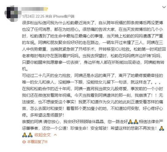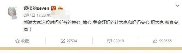 工作发作后2个月,谭紧韵正在元旦当天收了个微专感激粉丝们的体贴,并祝福各人安康,以后微专便很少再更新了。收集中的她至古有5、6个月出有呈现正在公家里前。