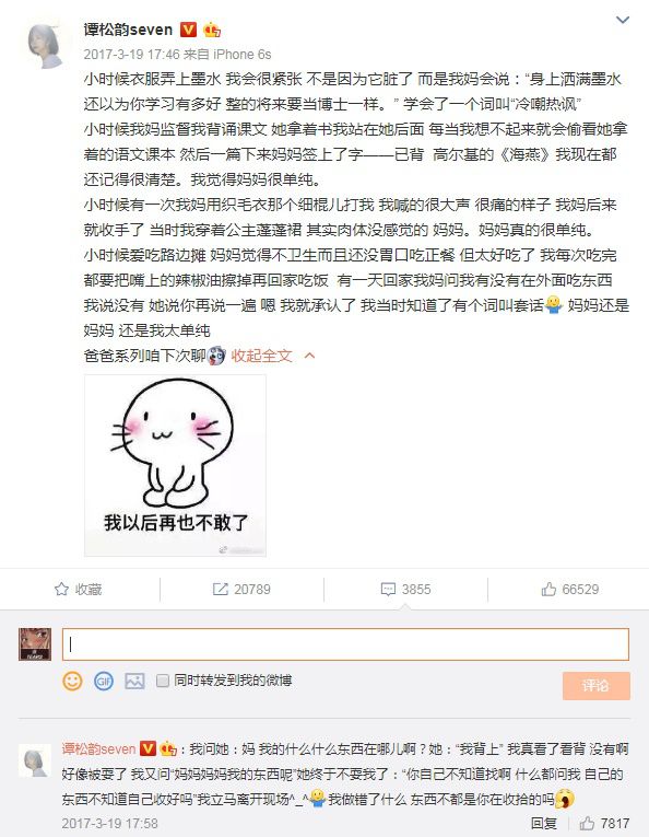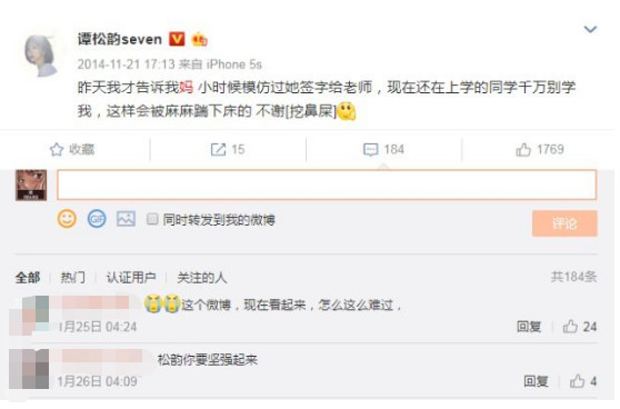 正在以往的微专中,谭紧韵常常记载战妈妈之间风趣的小事,好比小时分模拟过妈妈的署名拿给教师。