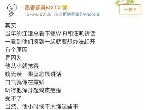 不外,有粉丝扒出了本著做者晚期的微专,微专上仿佛认证了魏无羡便是爱洒娇的素质。做者以江澄的视角动身,道他老是听没有惯魏无羡跟蓝记机道话,果为魏无羡只需一跟蓝记机道话,口吻便像正在洒娇。那样看去,仿佛肖战的归纳是准确的?