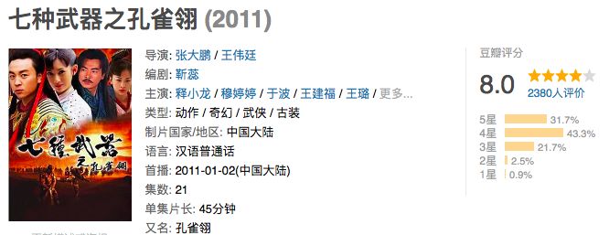 即使是2011年周易最初推出的一部影视剧《七种兵器之孔雀翎》,也仍然连结正在火准之上,豆瓣也借有8分评价。