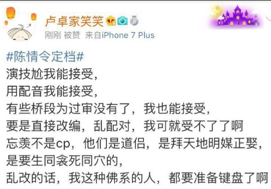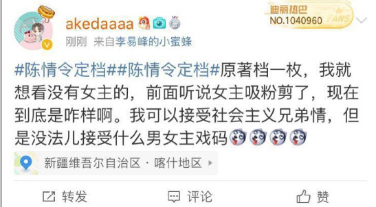 好吧,那些便算是一部剧的表面,丑面也能迁就。可是,主要的一面是本著的《魔讲祖师之陈情令》是一部耽好文,报告的是男男CP,大概道是汉子间的友谊吧,但是那样的人设不成能经由过程网剧的剧审,以是,《陈情令》硬死死的将那部具有年夜量同人文、同人图的男男CP,改成了一部有女主的恋爱戏!
