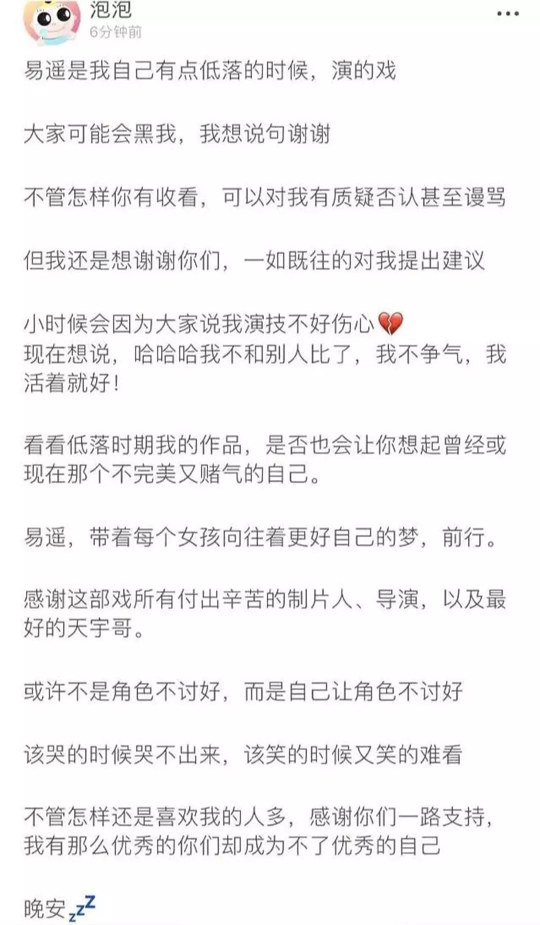 固然每一个人城市有感情降低的时分,也城市有正在感情降低时不能不完成事情的时分,但那其实不意味着能够天经地义天把感情带到事情上去,因而很多人以为正在越描越乌,以至量疑她之前的每部戏看起去皆是“感情降低”的模样。
